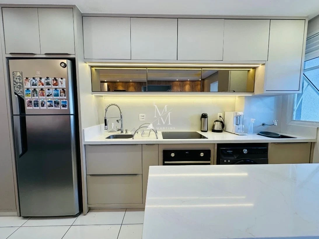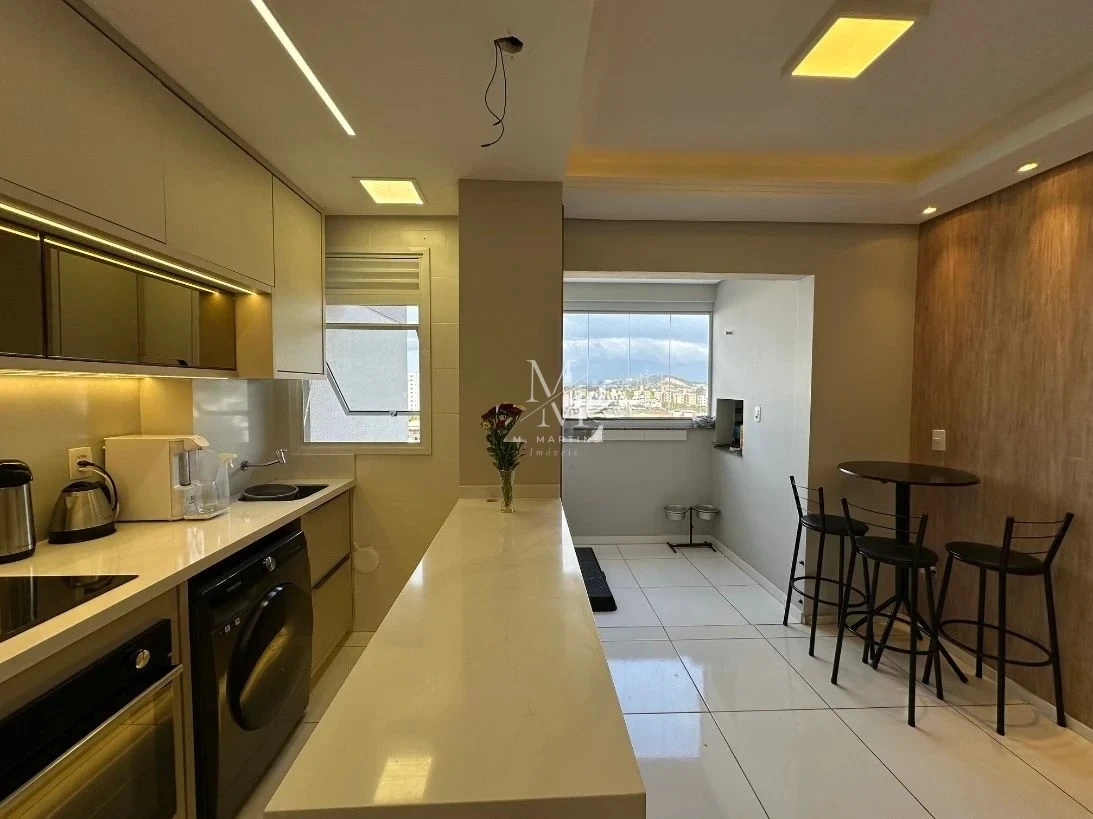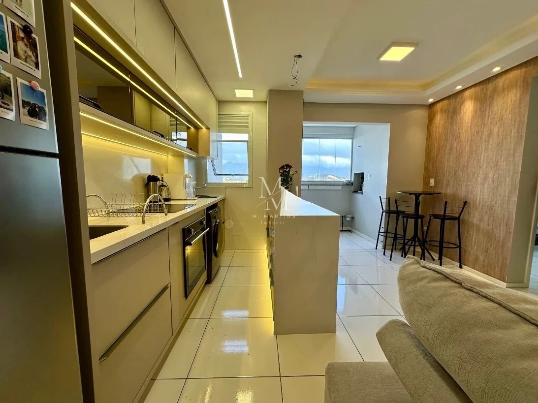 Apartamento 2 quartos em Pedra Branca, Palhoça com 59,80m² e móveis planejados inclusos. O imóvel possui 2 dormitórios sendo 1 suíte, 2 banheiros completos, sala de jantar e estar integradas, sacada com churrasqueira, cozinha planejada e 1 vaga de garagem coberta. Construído em 2019, apresenta acabamentos em massa corrida, hidrômetro e medidor de gás individuais, com escritura pública averbada.
